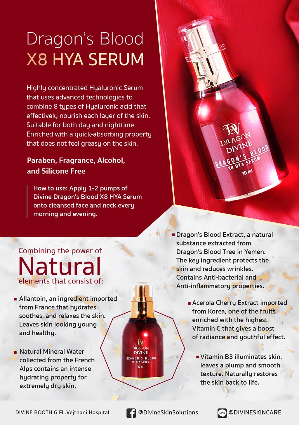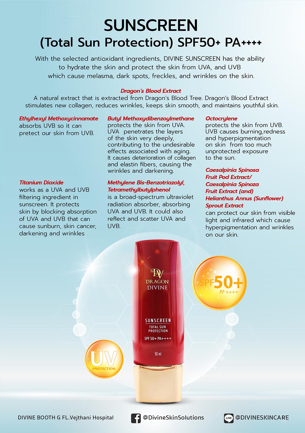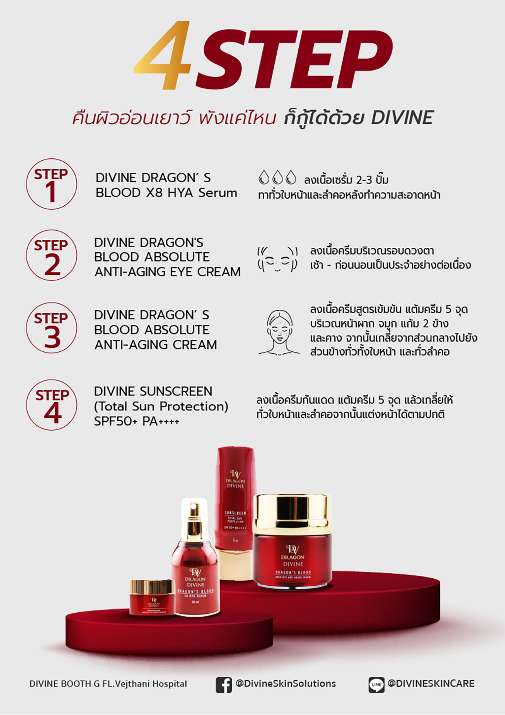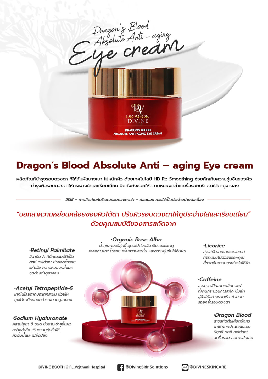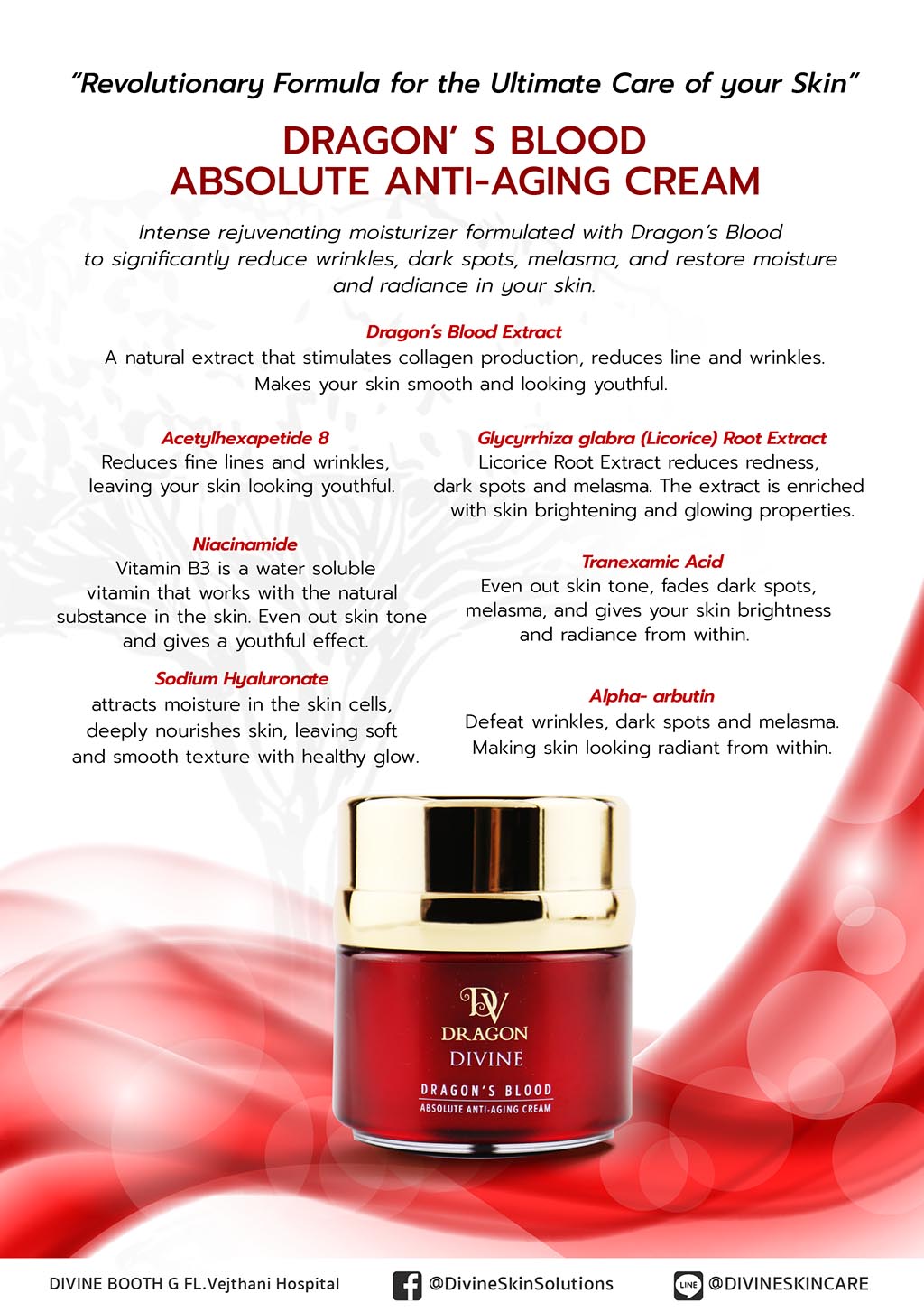 The miraculous knowledge of the “Dragon’s Blood” extract has been passed on to many regions including Southeast Asia, West Africa, East Africa, Western India and Socotra, an island of Yemen. This island has a hot and dry climate, and is the place where a dermatologist, who specialized in skin treatment of Asian people with over a decade of experience, traveled to and discovered the Dragon’s Blood extract, which was used to develop a beauty formula called “DIVINE Absolute Anti-Aging Cream”.